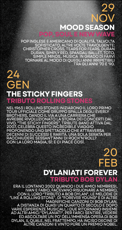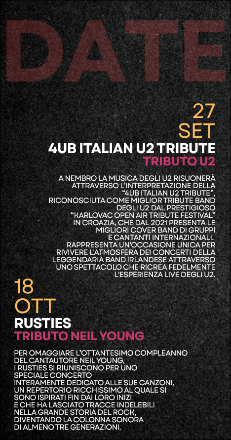 Per omaggiare l’ottantesimo compleanno del cantautore Neil Young, i Rusties si riuniscono per uno speciale concerto interamente dedicato alle sue canzoni, un repertorio ricchissimo al quale si sono ispirati fin dagli inizi e che ha lasciato tracce indelebili nella Grande Storia del Rock, diventando la colonna sonora di almeno tre generazioni.